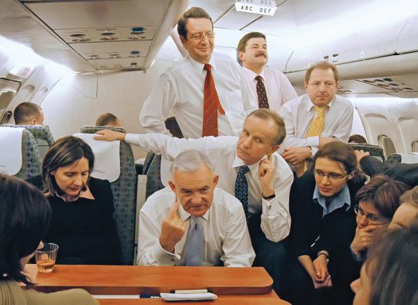Premier Leszek Miller i wicepremier Grzegorz Kołodko z dziennikarzami na pokładzie samolotu wracającego z Kopenhagi po udanych negocjacjach z UE.